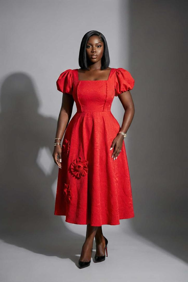 Tea length brocade dress with square neckline and beading at the front. The flared lower half of the dress has brocade flower appliques.